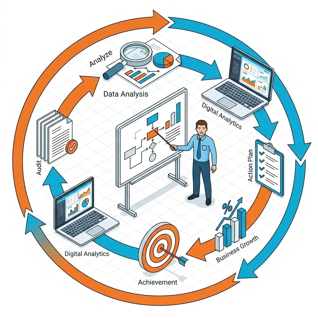 Nu dăm sfaturi din burtă. Fiecare sesiune de consultanță pornește de la date: analytics, Search Console, performanța campaniilor, comportamentul utilizatorilor pe site. De acolo construim recomandările.